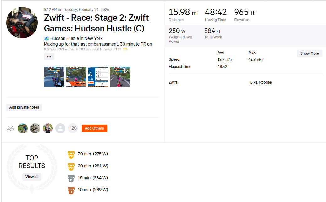 I'm not a racer. I'm not shaped like a racer, I don't have that kind of power. I may not have won, but I'd call this my best race yet. FTP bump, 10, 15, 20, and 30 minute power PRs. This is the second race in the Zwift Games series; I must be over-compensating for the embarrassment that was stage 1 - I just barely missed coming in DFL. It was so bad. Unfortunately, I don't think stage 3 will go so well. No way I'll recover before that!!
